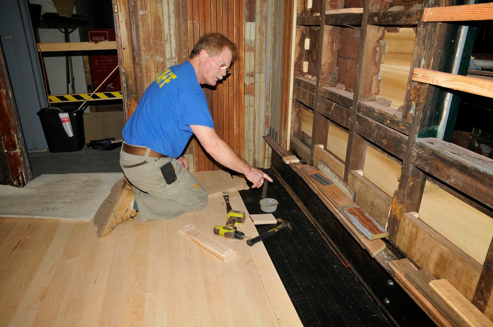 New sugar maple flooring was supplied by a regional wholesaler and installation began in late August. (A botanist confirmed that samples of the original flooring were hard or sugar maple.) A layer of roofing felt was applied below the flooring. To help stabilize and strengthen the floor, a 3/8 plywood underlay was installed over the sub floor. This feature was a departure from the original design but was added to improve stability over the bolsters at the car ends.