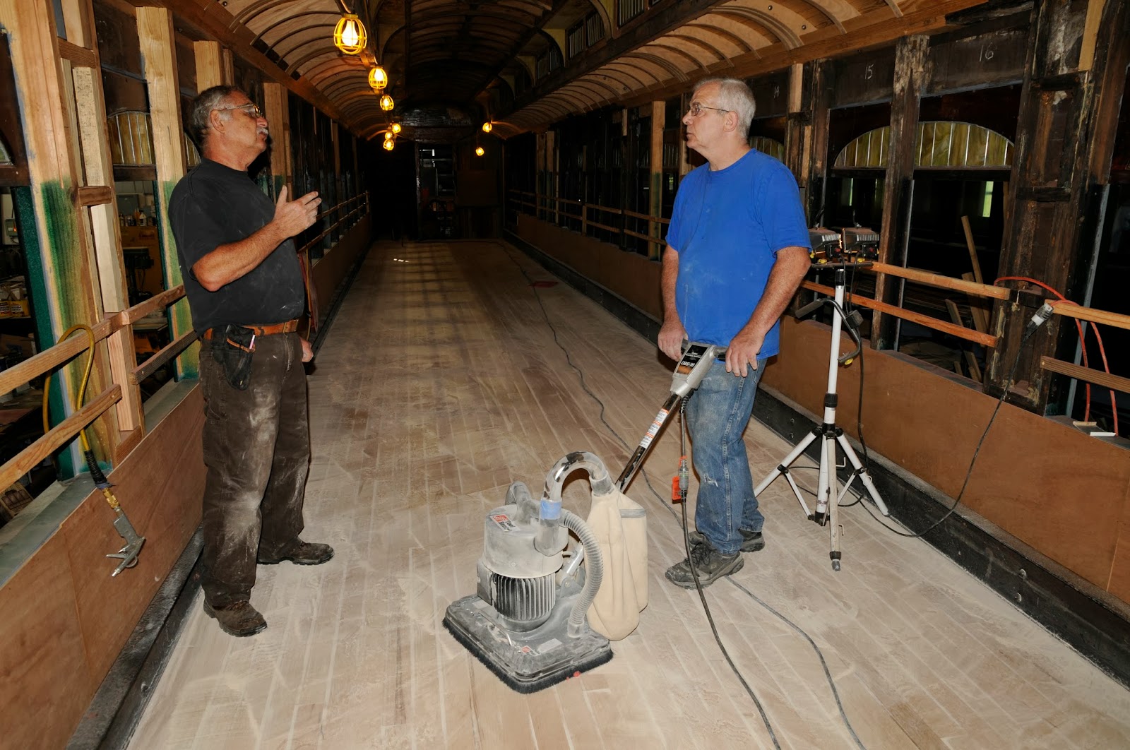 Rehabilitation of coach 218 is involving nearly every aspect of the car. This fall, the focus has been returning the floor to its former grandeur. The solid maple floor was badly deteriorated and the decision to completely replace it was made early in the project. The completed floor is now ready to receive its first guests!