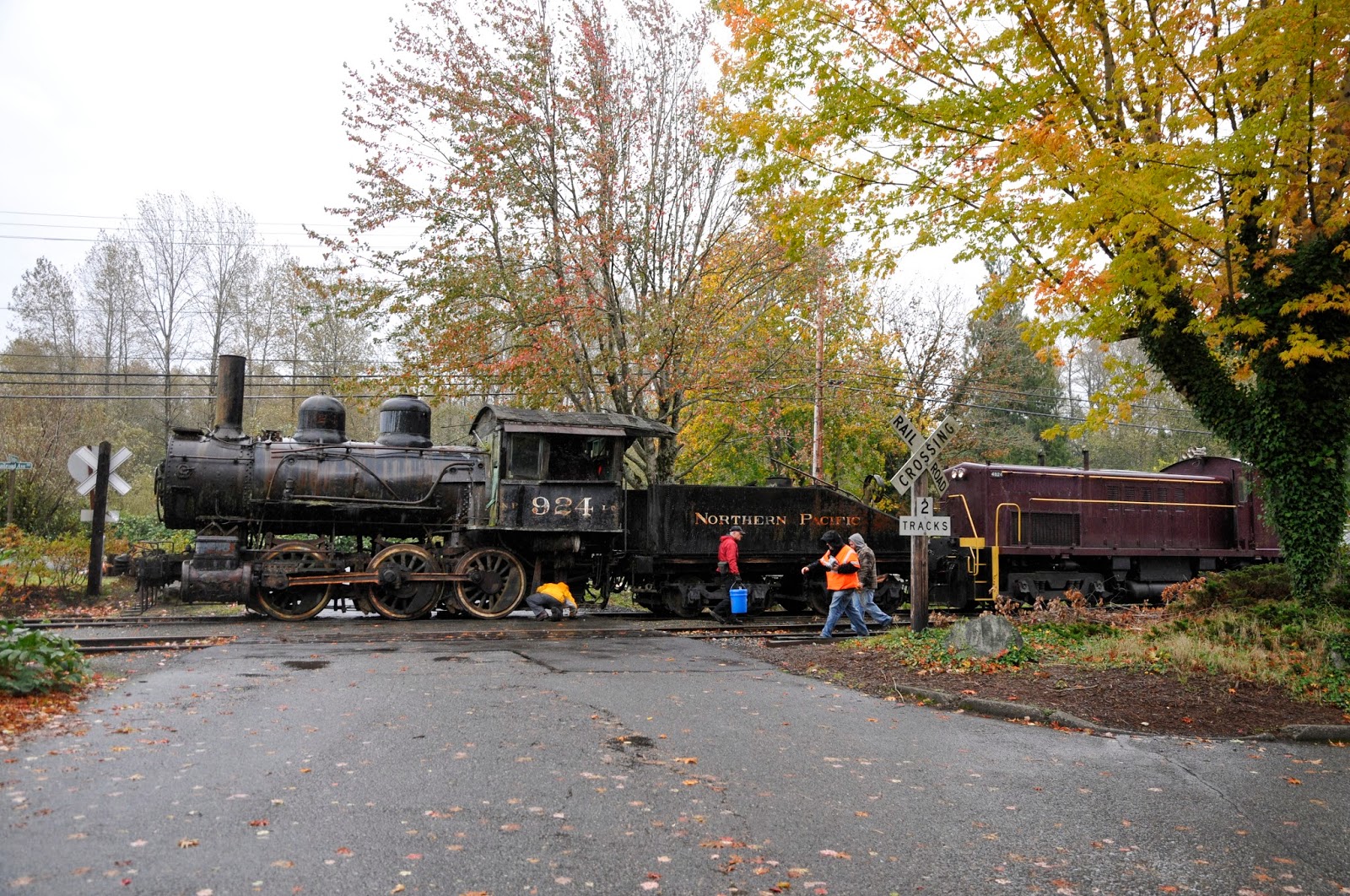 The Northwest Railway Museum steam program officially launched today with the movement of former Northern Pacific Railway steam locomotive 924 to the Conservation and Restoration Center. The 1899-built Rogers six-coupled locomotive was carefully pulled from the static exhibit track in Snoqualmie by Baldwin Lima Hamilton-built diesel-electric locomotive 4024, an RS4-TC that powers regular trains at the Museum. Work to collect data that will eventually allow the boiler to be certified is expected to begin shortly.