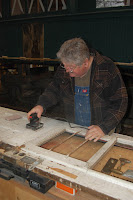 The experience of Glenn Guerra suggested sanding the paint off in the center of the door. Then more sanding, this time by hand with 320 grit wet/dry sand paper and mineral spirits. Still more sanding, still by hand but with 600 grit wet/dry sand paper and mineral spirits. Carefully, the surface was wiped with alcohol. (Earlier testing confirmed that the “original” finish was shellac and it will dissolve in alcohol but not mineral spirits.) About two hours were invested in this “scholarship” and the results are real and lasting: the now 111-year-old builder’s original guilded and hand lettered “name plate” has been identified, recorded and preserved.