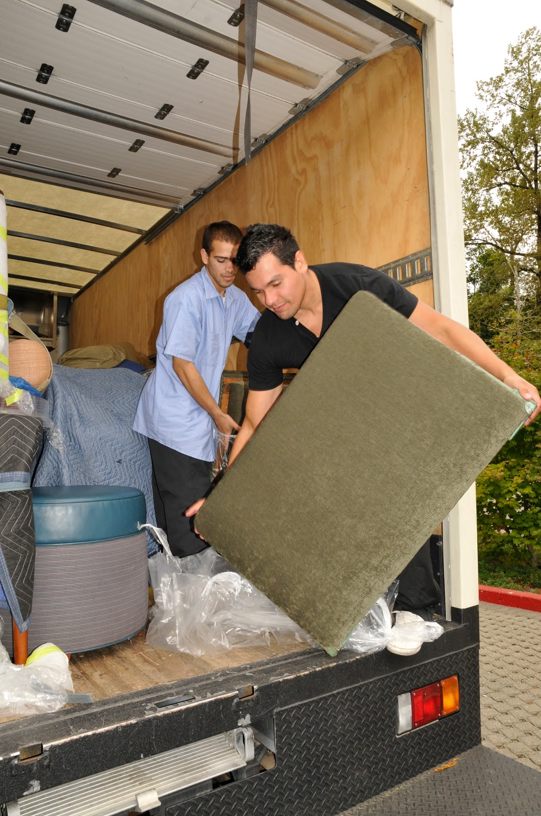 Workers from Queen Anne Upholstery unpack and unload the reupholstered seats.