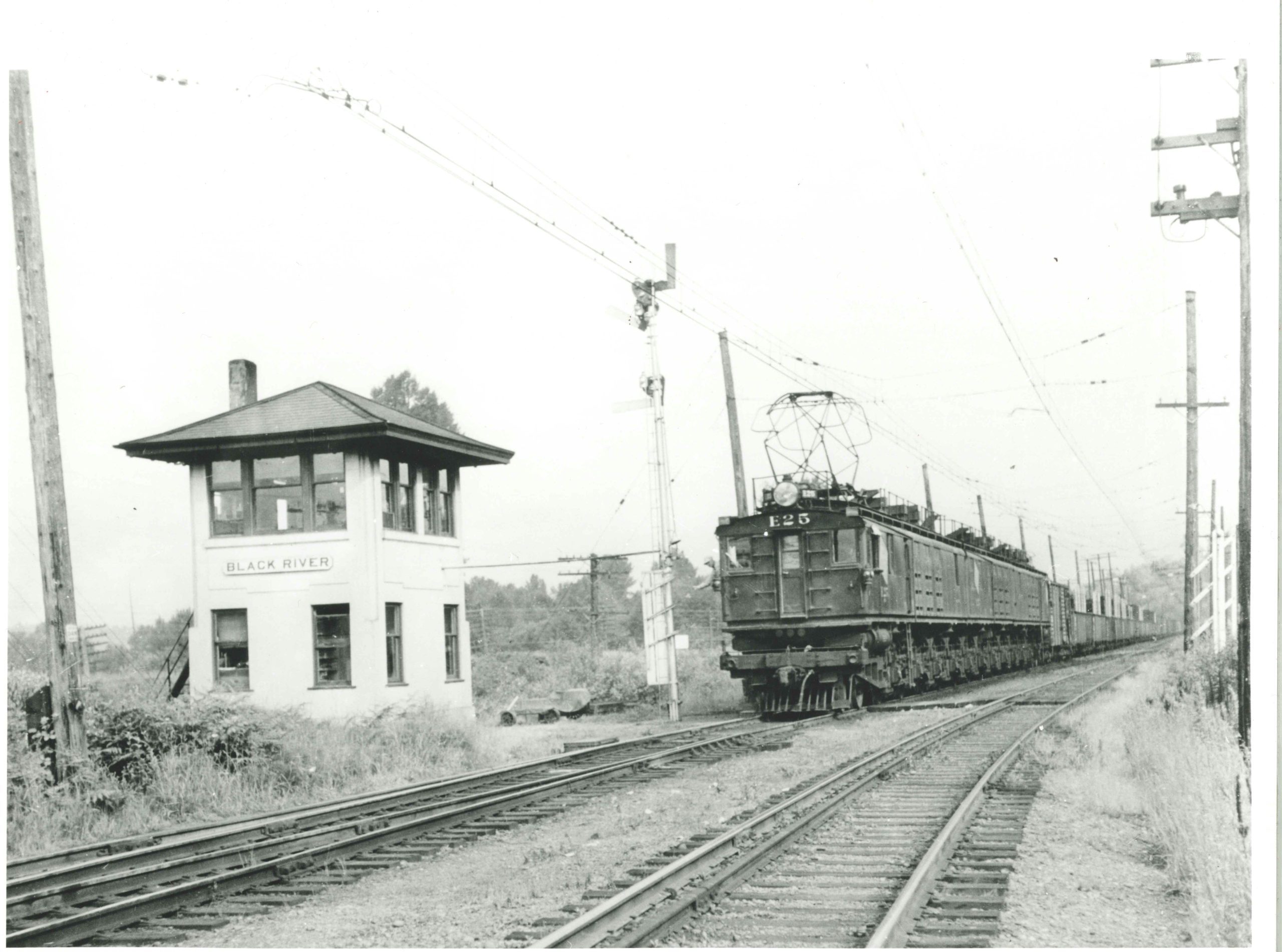 A Milwaukee Road train headed by boxcab electric E-25 rolls past the Black River interlocking tower at Tukwila, Washington circa 1935. Charles Turner photo, NRM collection.