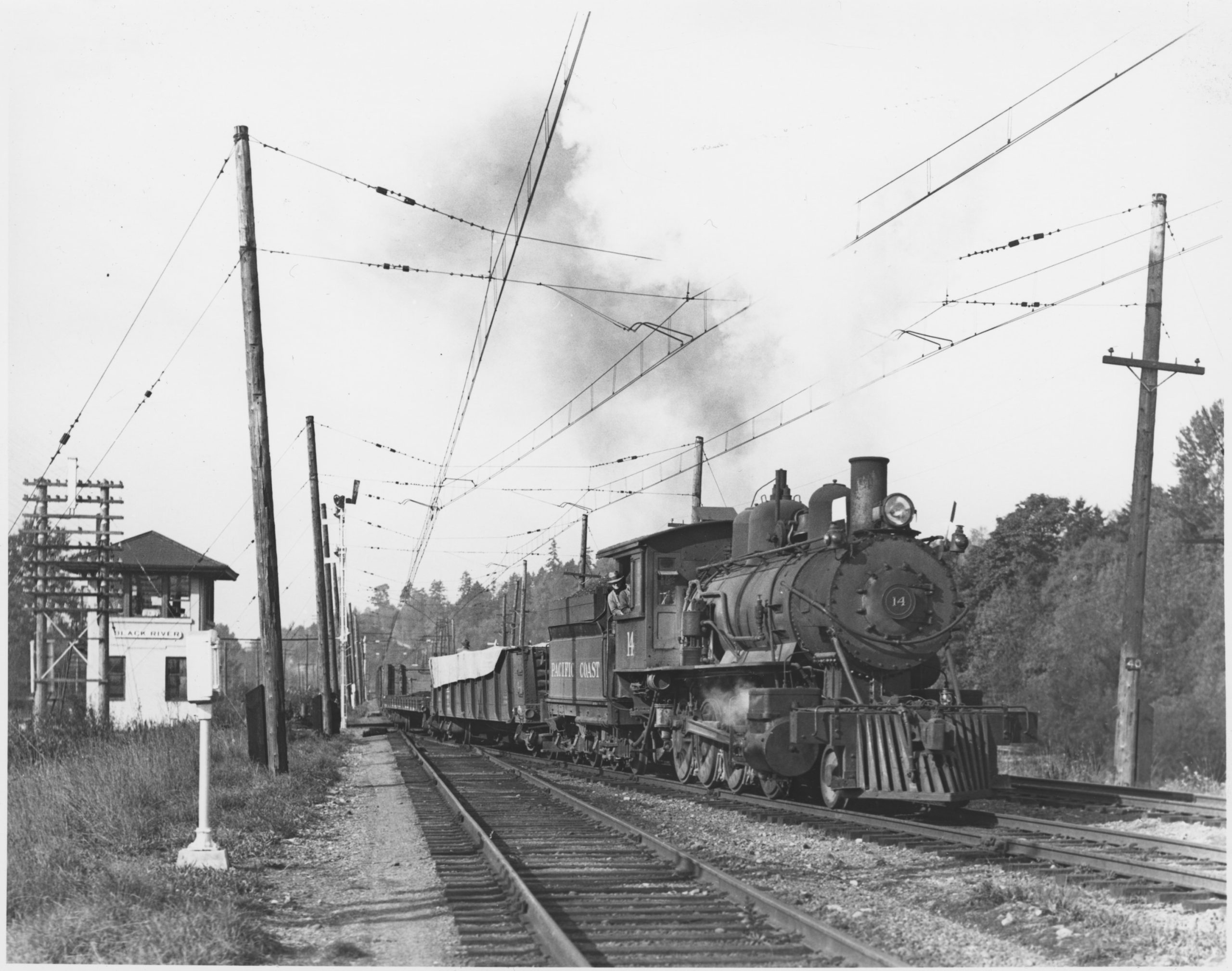 Pacific Coast Railroad locomotive #14 pulls a train past the Black River tower at Tukwila on October 22, 1935. Overhead wires are the catenary for the Milwaukee Road’s electric locomotives. Charles Turner photo, NRM collection.