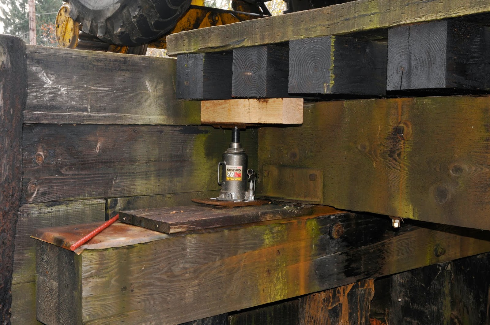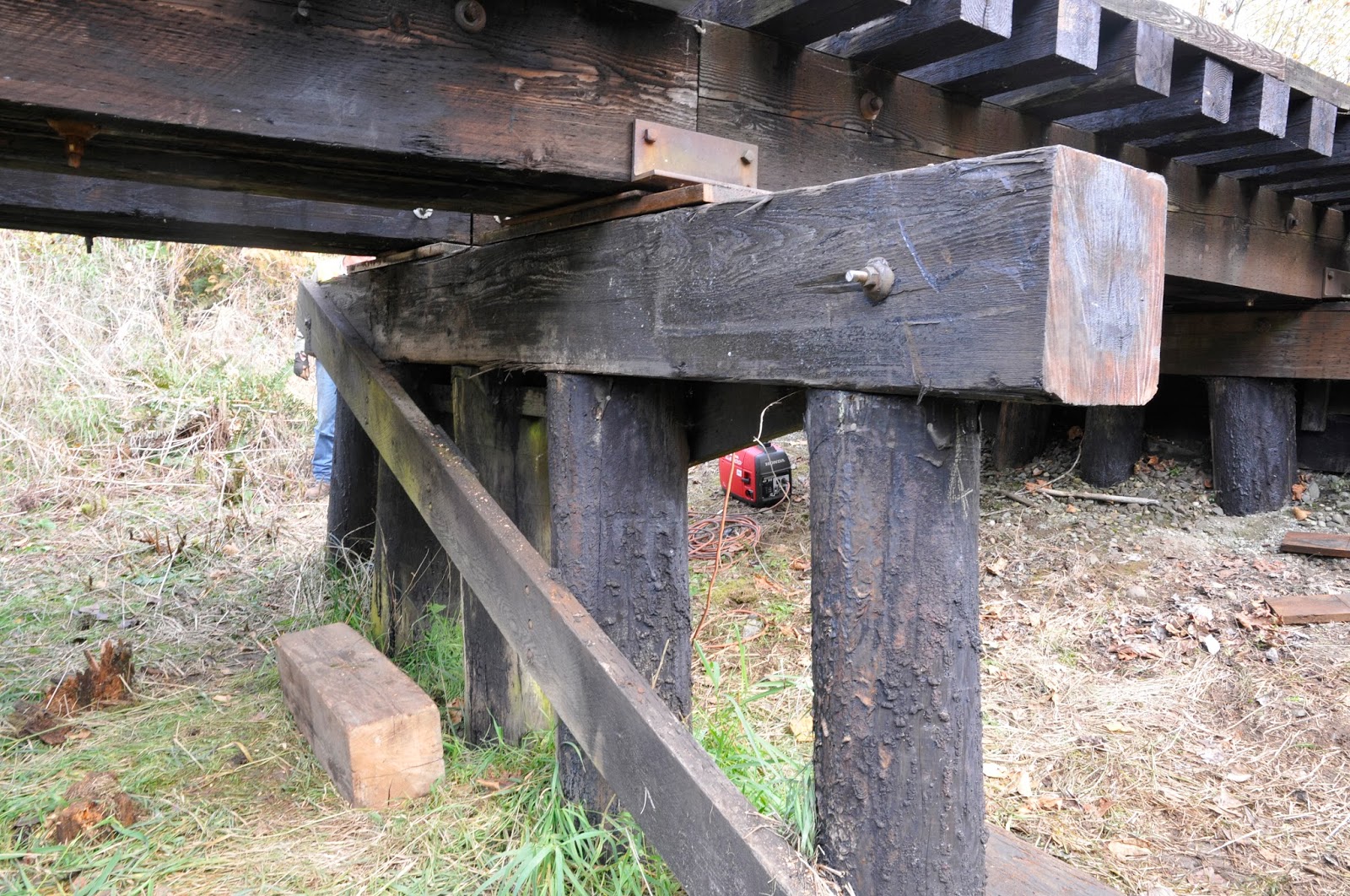 During the 2013 inspection, two pile caps were identified for replacement. Caps are large timbers that sit on top of the piles and support the stringers, the long beams that run from one pile cap to the next and support the deck. The inspection team estimated that they each had less than two years of life remaining. So in Fall 2013, two recycled old growth timber caps each 14 inches by 15.5 inches and 14 feet long were purchased from a dealer and installed. Each cap took approximately 7 hours to exchange, and work was completed without delay or incident.