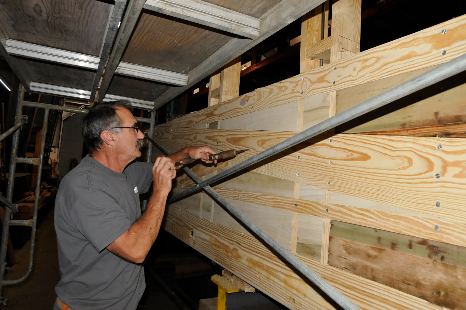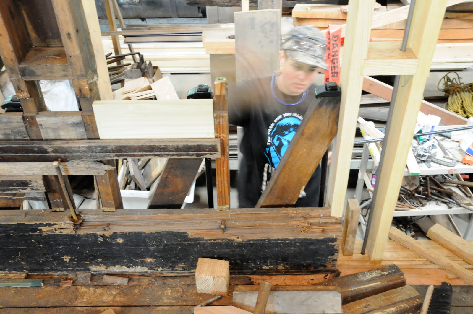 Meg G. begins installing bracing in the new side sill. A missing section of the truss plank evidenced in the foreground will be spliced in. The truss plank is made from Douglas fir and was the only Northwest wood used in the 1898 construction.
