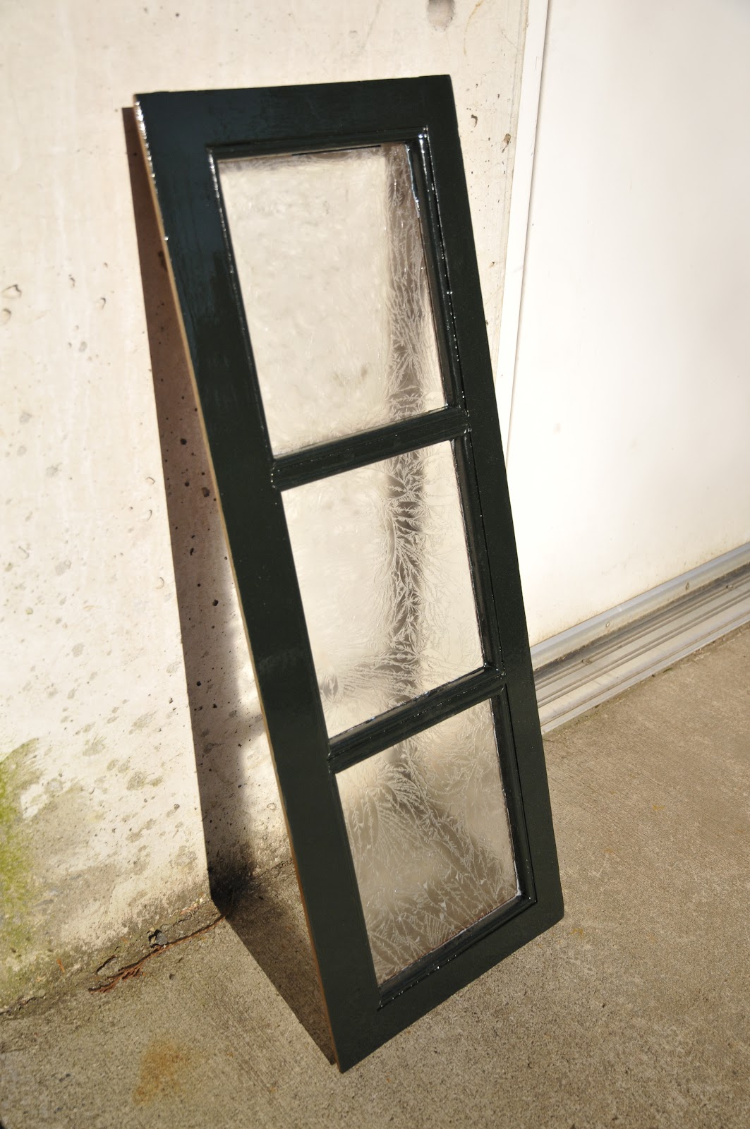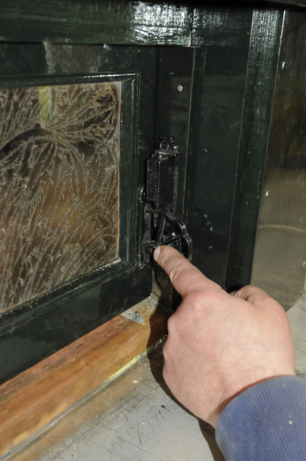 After the varnish process was completed, the outside of the frame received primer. Then the windows were glazed and the final coats of dark green were applied to the exterior.