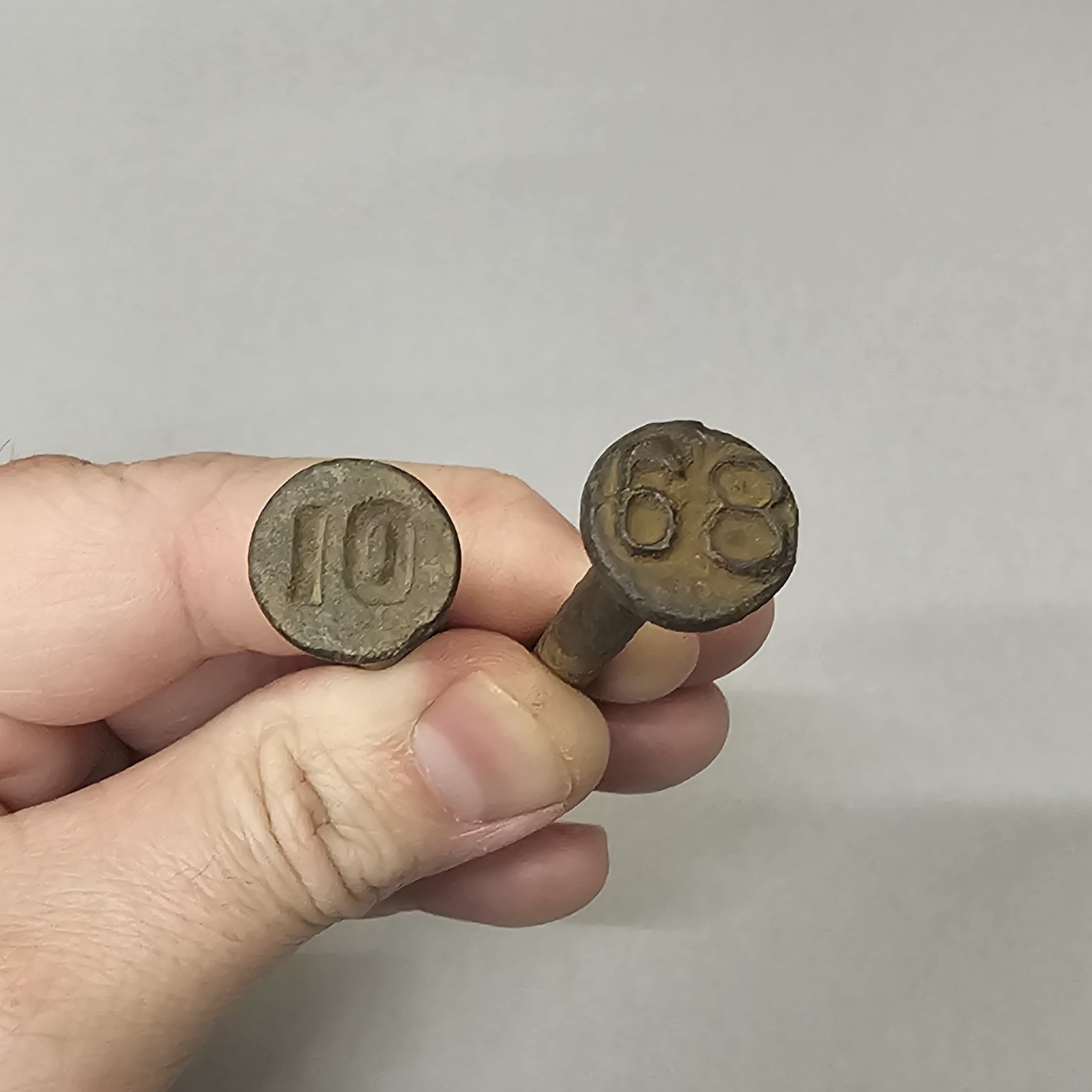 The oldest and newest date nails in the Museum’s collection: 1910 & 1968. The 1910 nail has recessed numbers, and the 1968 nail has raised numbers.