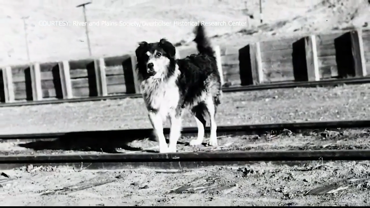 Shep the sheepdog standing in the middle of the train tracks, a dangerous place nobody should ever stand. Photo courtesy of River & Plaines Society/Overholser Historical Research Center.
