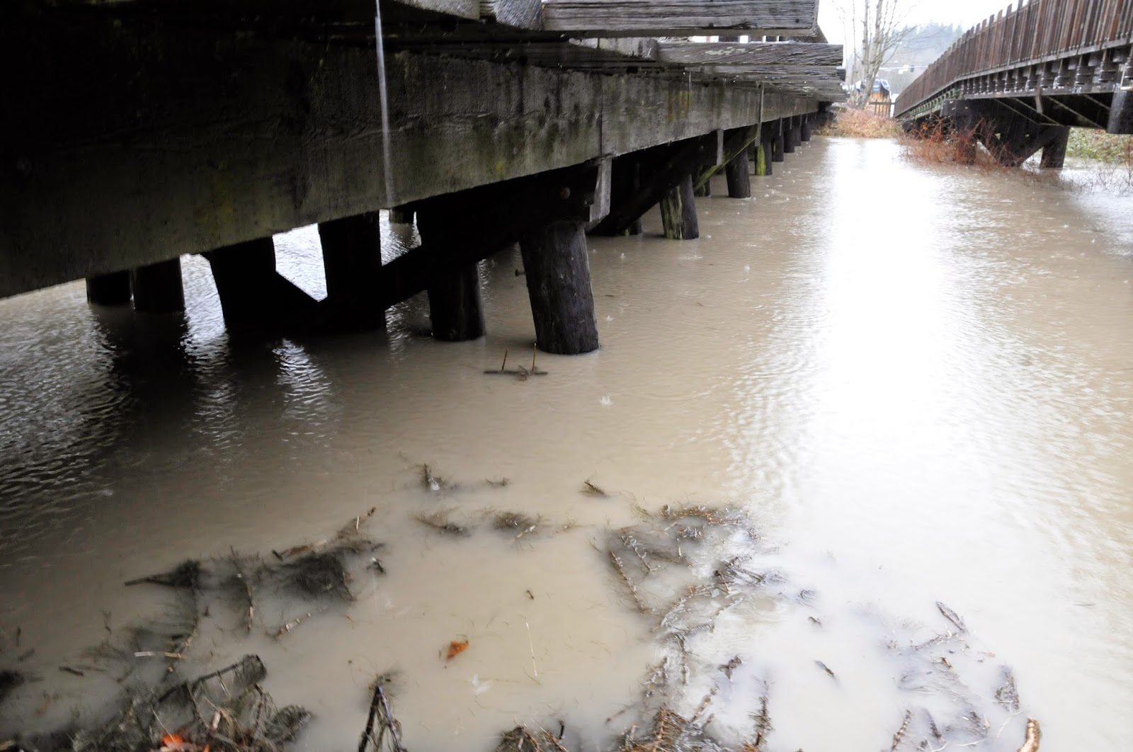 Bridge 32 in downtown Snoqualmie is quickly engulfed in water. Normally, Kimball Creek is 18 inches deep and about ten feet wide.