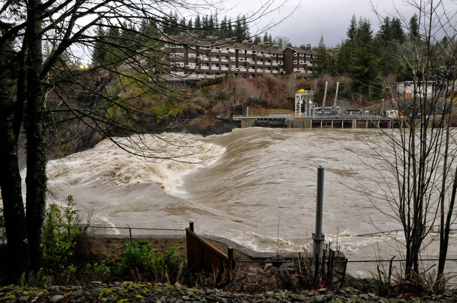 The Salish Lodge and Spa keeps watch over an angry river as it plunges over the top of Snoqualmie Falls.