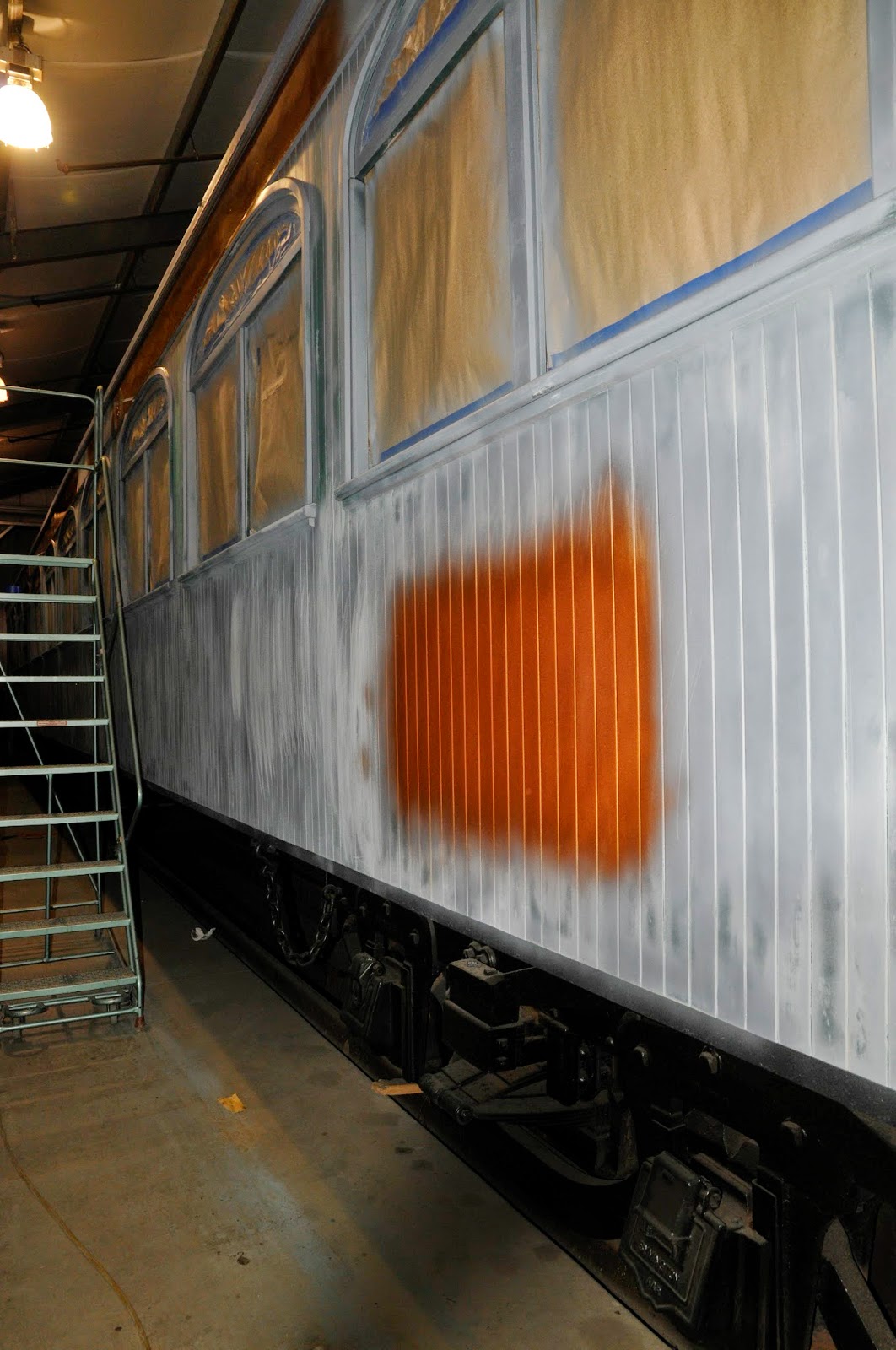 Lettering in era it was built was usually gold leaf, which were actual thin sheets of gold attached to the side of the car with an adhesive. Gold leaf could have been applied to the 218, but it is a skill set not resident at the Northwest Railway Museum. Fortunately, modern metallic paint can give an appearance very similar to gold leaf by using a paint mask over a pre-painted metallic gold surface. The artisans in the Museum’s Conservation and Restoration Center were able to create the stencils and paint mask required to reproduce that look, and earlier this fall the lettering made its first appearance.