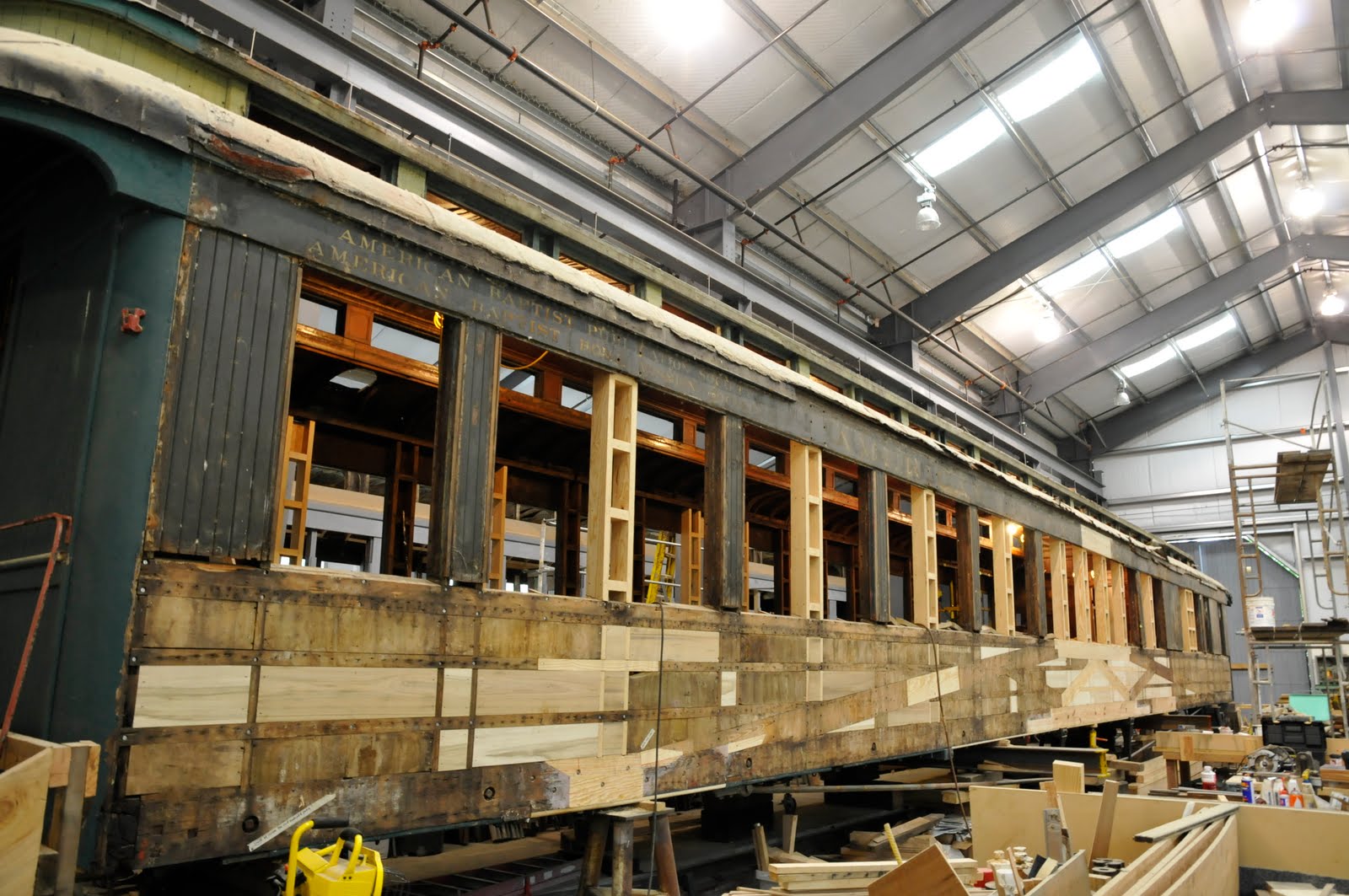 In February 2011, rehabilitation of Chapel Car 5 Messenger of Peace began in earnest. A crew of three worked full time on the car and completed all the car body structural repairs. By year end, more than 7,000 hours had been invested in the project and all the exterior cladding was being applied. Other highlights include manufacture of replacement windows and the draft and platform sills.
