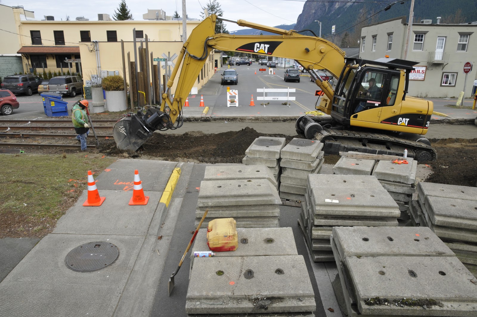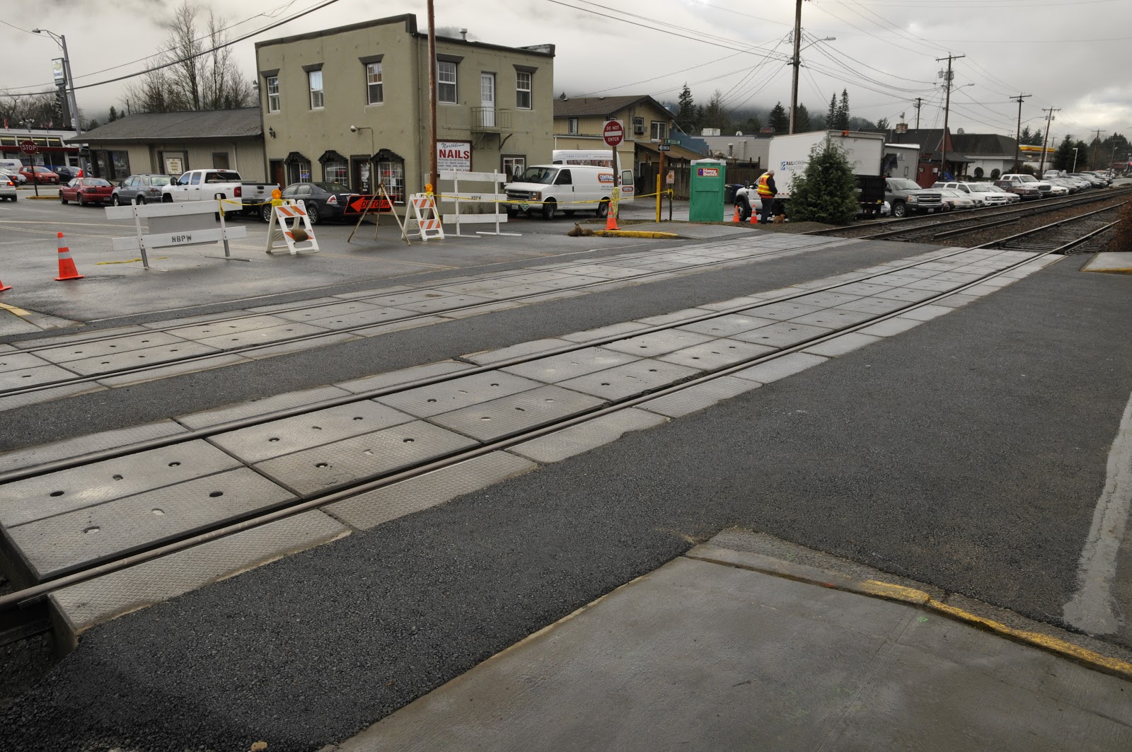 The new crossing takes shape on Main Street in North Bend. Concrete tubs eliminate the use of railroad ties in the crossing.