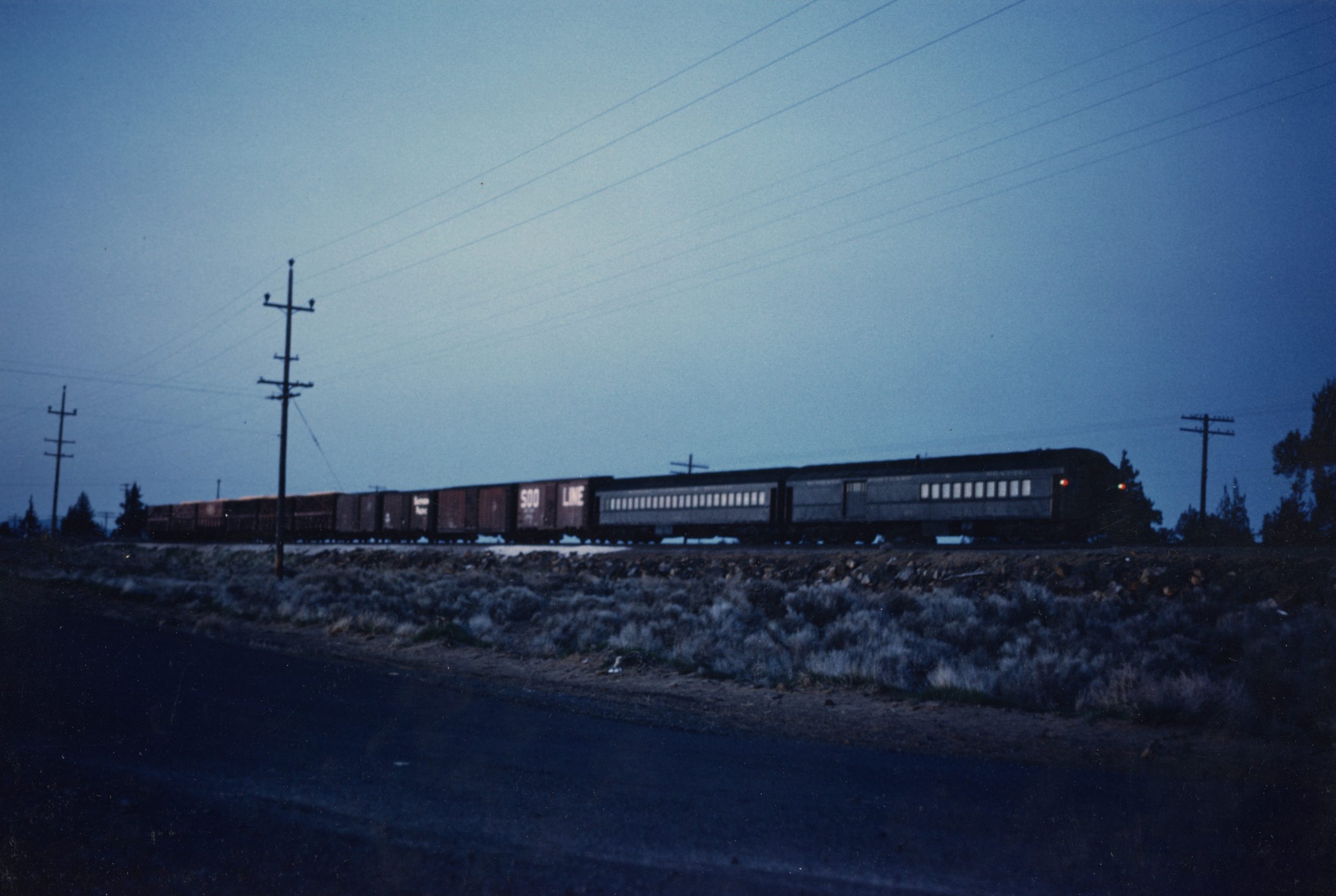 Spokane, Portland & Seattle Baggage-Coach 272 or 273 with an extra coach as part of a mixed train. NRM collection.