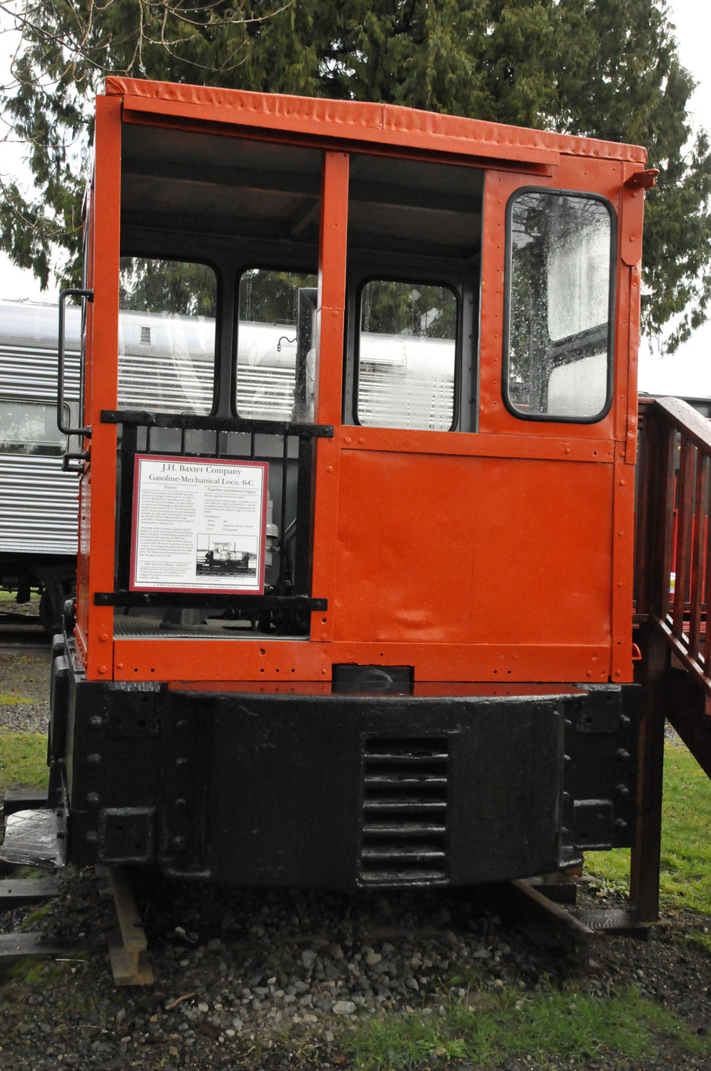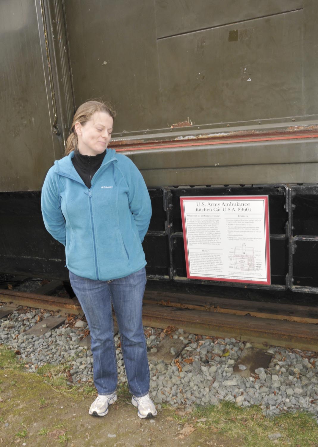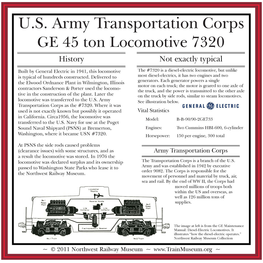 The Museum’s Educator, Jessie Cunningham, is responsible for all exhibits and interpretation at the Museum. She worked closely with Fossil – in what turned out to be a lengthy process – to order the new signs. The first step was getting a quote to determine if signs were in the budget – they were. Cunningham and Executive Director Richard Anderson determined the three objects to create signs for. All three large objects will remain at the Snoqualmie Depot for the foreseeable future – which is why they were selected: Army Ambulance Kitchen car 89601, J.H. Baxter Co. locomotive 6-C, and Army Transportation Corps locomotive 7320 (also known as Cecil the Diesel). Each large object now has a new 17” x 17” sign.