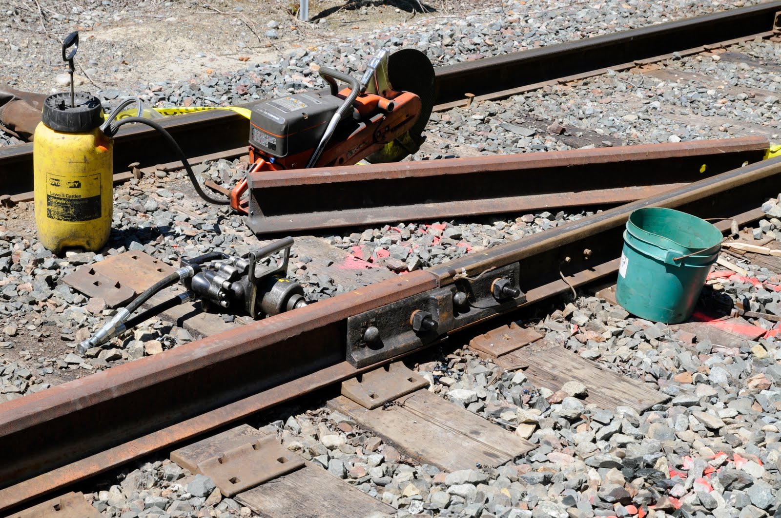 Special compromise joint bars transition between the new welded rail and the existing rail. (Note the different height.)