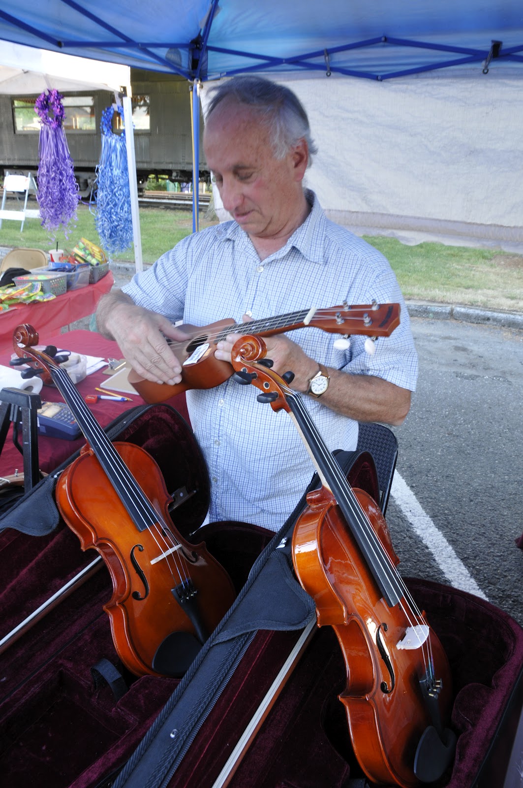 Reconditioned string instruments were offered for sale by a non-profit at one of the vendor booths.