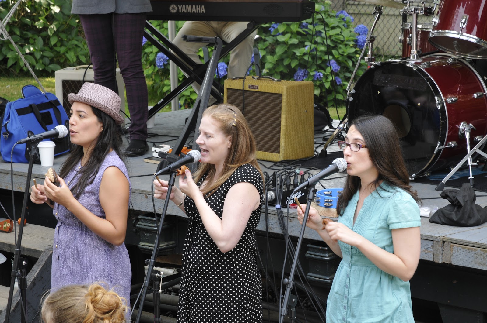 Singers from the band Brian Vogan & his Good Buddies perform their original music on the Skagit flatcar stage at the Snoqualmie Depot.