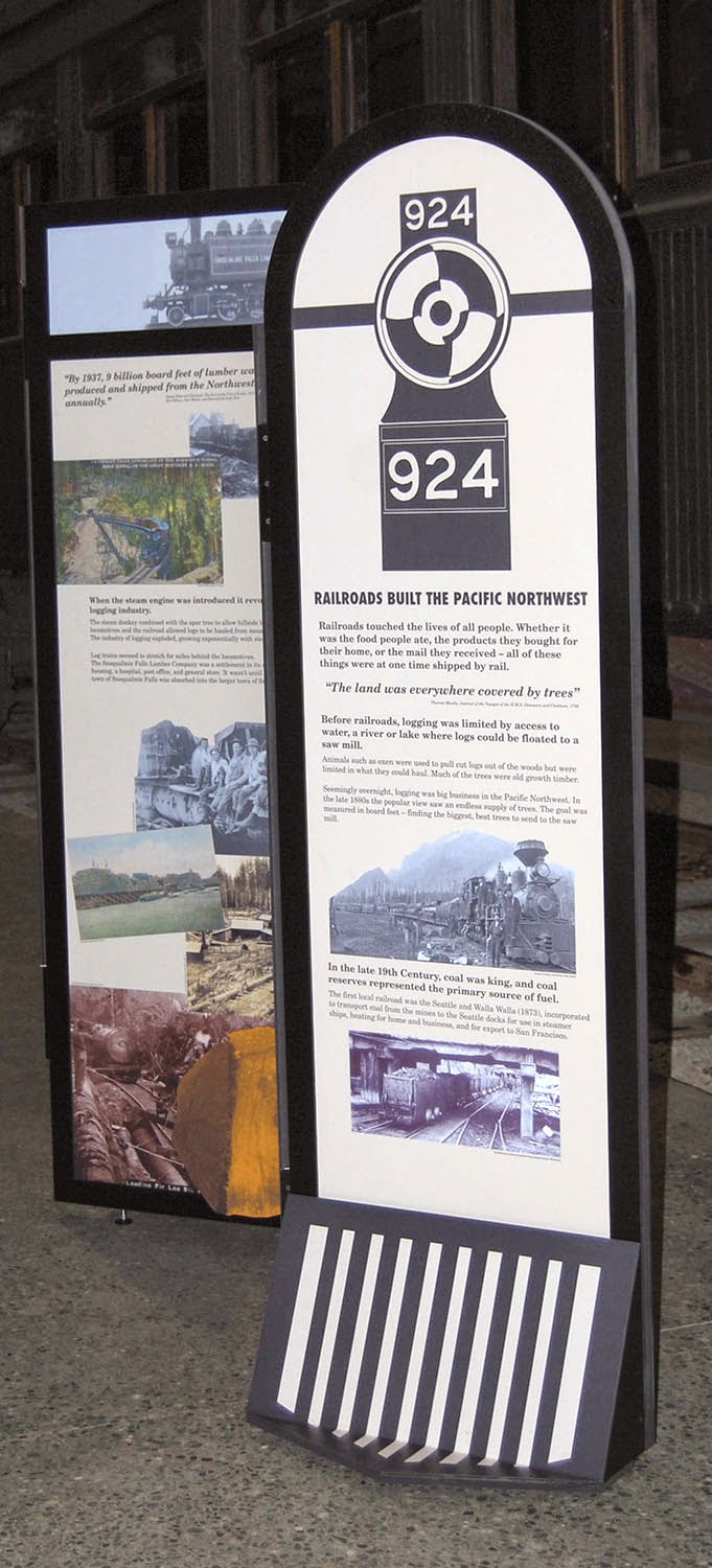 If you have the time in the next month, visit the Snoqualmie Depot to view the new exhibit: Railroads Built the Pacific Northwest. The exhibit is a free-standing display of 4 double-sided interlocking panels highlighting early passenger and freight service in the PNW.